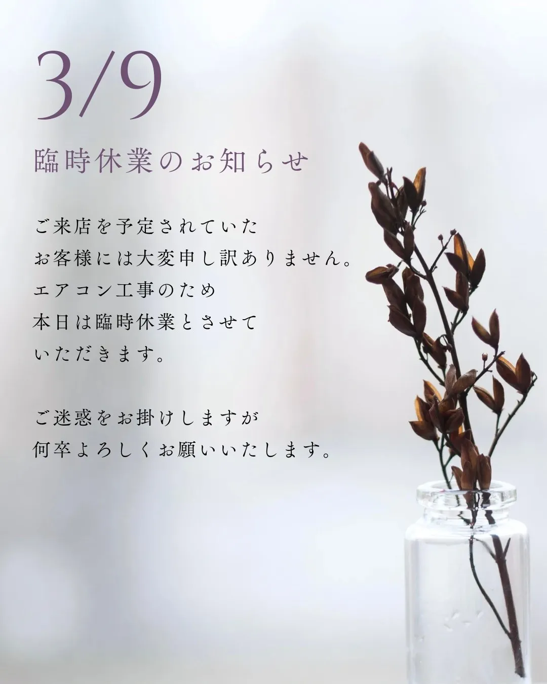 【本日3月9日(月) 臨時休業のお知らせ】